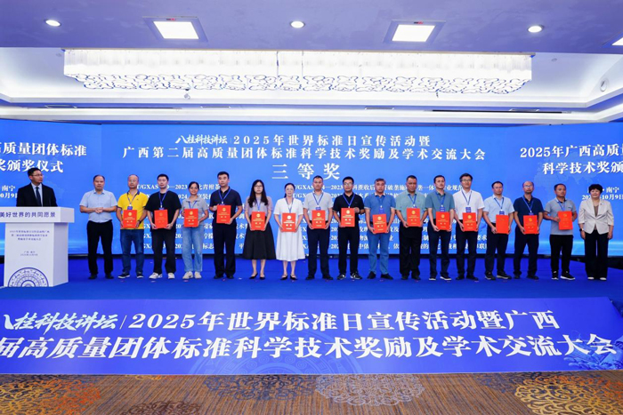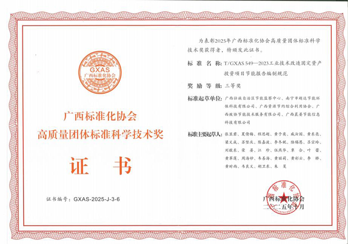 2025年10月9日,由中国标准化协会指导,广西标准化协会主办的“世界标准日宣传活动暨广西第二届高质量团体标准科学技术奖励及学术交流大会”在南宁隆重举行。广西节能降碳协会参与草的《工业技术改造固定资产投资项目节能报告编制规范》(T/GXAS 549-2023 )荣获高质量团体标准科学技术三等奖。
